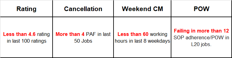 A: Metrics include ratings (L100 Rating), cancellations (L50 PAF), weekend working hours (L8 WCM), and SOP adherence in the last 20 jobs. Each rank has specific standards for these metrics.