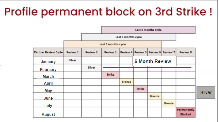 Answer : The partner profile will get permanently blocked if 3 strikes are levied on the profile in the rolling 6 months. For example, in the performance review of June 2024, the rolling period will be Jan 2024-June 2024, i.e., 6 months. In the performance review for July 2024, the rolling period will be Feb 2024-July 2024.